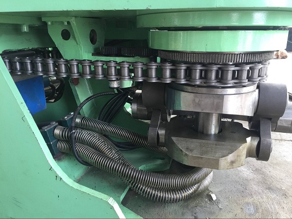 1、將管子(或型材)抱緊在頂鐓機構(gòu)(d)半圓槽(型腔)內(nèi)實現(xiàn)頂鐓工藝。2、為了避免管子(或型材)在彎制≥180度是可能產(chǎn)生的干涉,必須與壓料道軌模(c)動作高度一致。 |