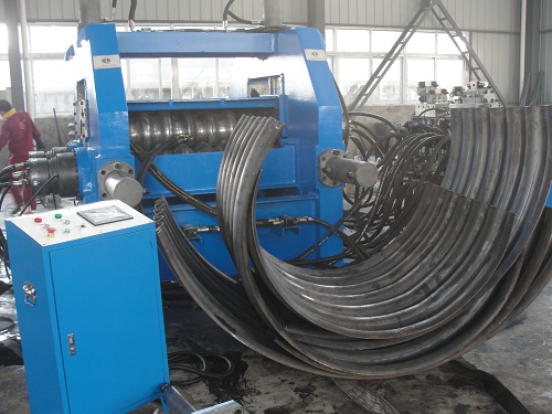 (5)考慮到卷制的應力無法消除導致卷制后的成品兩端收縮,我公司在反復試驗過程中得到很多寶貴經(jīng)驗,其中一項是在波紋板卷制成品之前給予一定量的反向變形,成品后自然矯正。