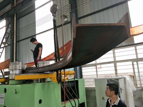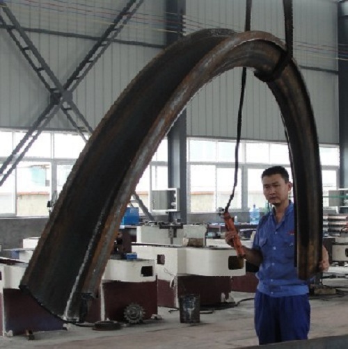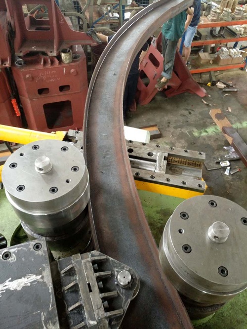 07.回轉(zhuǎn)電動和液壓位移驅(qū)動:一次上料完成,各種型材(角鋼、槽鋼、H型鋼、圓鋼等)端部預(yù)彎和回轉(zhuǎn)彎曲成型,可將各種型材彎曲成所需要的圓形、弧形、螺旋形、橢圓形等預(yù)定曲率工件。