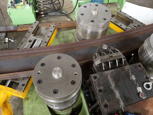 1.兩側(cè)托輥均由三個油缸驅(qū)動托料回轉(zhuǎn)裝置,實現(xiàn)三維運(yùn)動(即:上下、左右、前后),防止非對稱截面型材彎曲時的扭曲變形。 2.亦可實現(xiàn)螺旋盤彎時對螺距的控制。 |