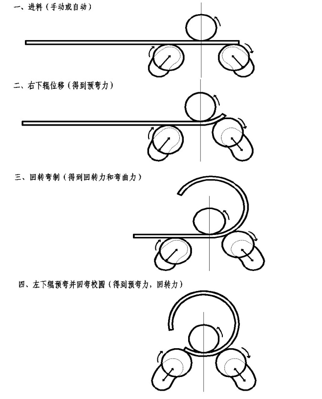 本機床采用弧線結(jié)構(gòu)三(四)輥滾彎壓制原理(參見原理示意圖),原材料(型材),送入機床后,輔助輥和右下輥位移(得到預(yù)彎力和彎曲力),前端料預(yù)彎(同時液壓托輥糾偏),三個主動輥轉(zhuǎn)動得到回轉(zhuǎn)力(得到回轉(zhuǎn)力),彎曲;末端時左下輥位移,后端料預(yù)彎,三個主動輥回彎校圓,完成型材卷圓或(輥壓托輥工作)螺旋盤制。操作過程中由人工腳踏開關(guān)或人機界面(彩色觸摸屏)控制,便于操作者高效工作和觀察控制成型過程(參見原理示意圖)。